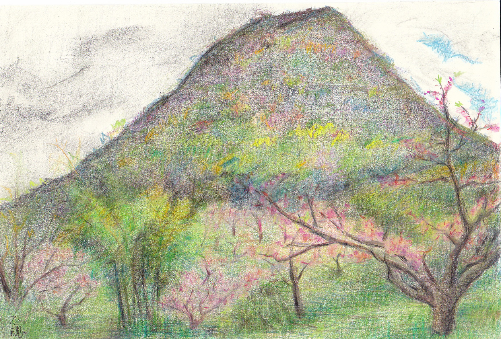 冒頭の絵は。讃岐富士といわれる飯野山の桃畑のスケッチで、藤川宏樹さんの作品です。